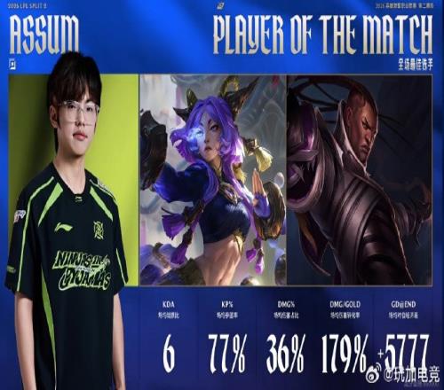 Assum兩局合砍19511的戰(zhàn)績,拿下NIP對陣JDG系列賽MVP