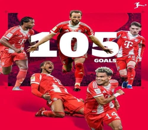 第29輪5比0戰(zhàn)勝圣保利之后,拜仁本賽季德甲打入105球,刷新德甲單賽季進(jìn)球紀(jì)錄。此前紀(jì)錄是拜仁在1971-72賽季創(chuàng)造,當(dāng)時共打入101球。