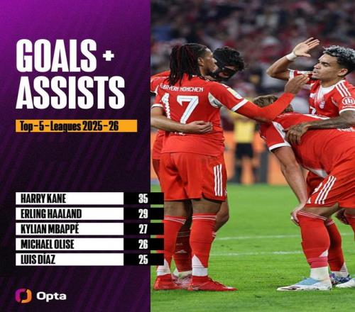 本賽季五大聯(lián)賽參與進球25+球員:拜仁獨占3人,其余球隊2人