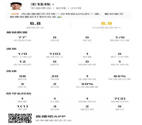 王鈺棟數(shù)據(jù):傳球成功率85%包括1次關(guān)鍵傳球,共12次丟失球權(quán)