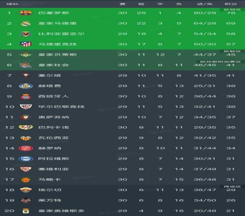 北京時(shí)間4月5日,西甲第30輪率先結(jié)束了5場比賽,我們看看最新積分榜的變動,主要的戰(zhàn)況是巴薩2-1絕殺馬競,皇馬1-2被馬略卡絕殺,西班牙人0-0皇家貝蒂斯,皇家社會2-0萊萬特,巴列卡諾1-0埃爾切!
