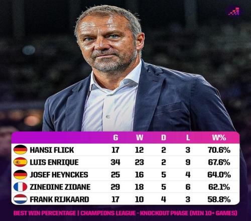 據(jù)統(tǒng)計,弗里克總共帶領拜仁和巴薩征戰(zhàn)17場歐冠淘汰賽,取得12勝2平3負的優(yōu)異戰(zhàn)績,這位德國教練是歐冠淘汰賽階段至少執(zhí)教10場勝率最高的主教練。