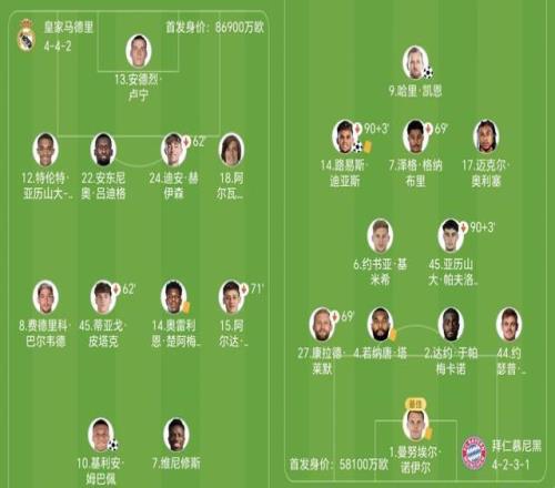 兩隊將為半決賽席位展開激烈較量,皇馬首發(fā)球員身價8.69億歐元,高于拜仁5.81億歐元,紙面實力看似較為占優(yōu)。