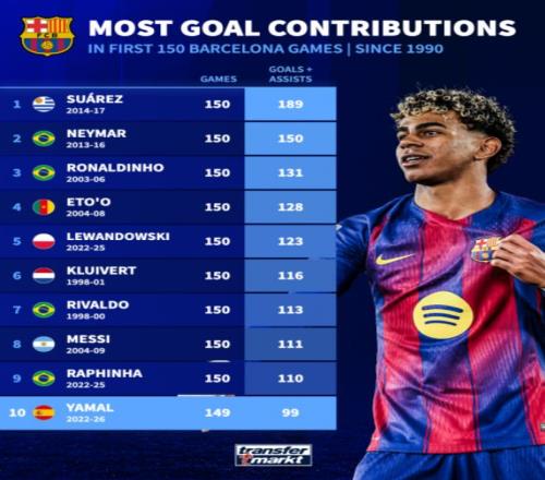 同時(shí),在巴薩隊(duì)史前150場(chǎng)進(jìn)球+助攻最多的前十名球員里,亞馬爾也榜上有名。