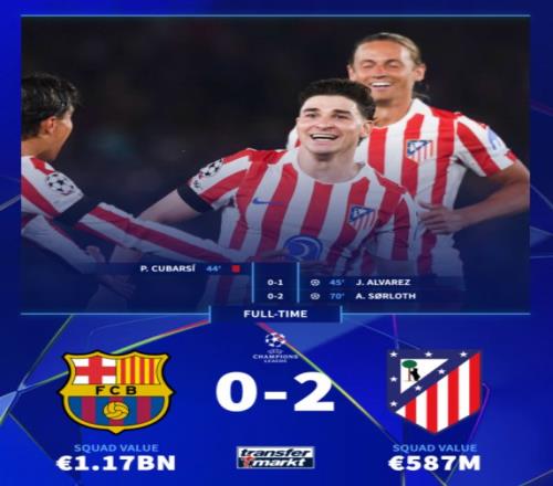 年輕后衛(wèi)庫(kù)巴西上半場(chǎng)就被紅牌罰下,讓巴薩非常被動(dòng),加上阿爾瓦雷斯和索爾洛特的進(jìn)球,巴薩想要在大都會(huì)球場(chǎng)翻盤難度很大。