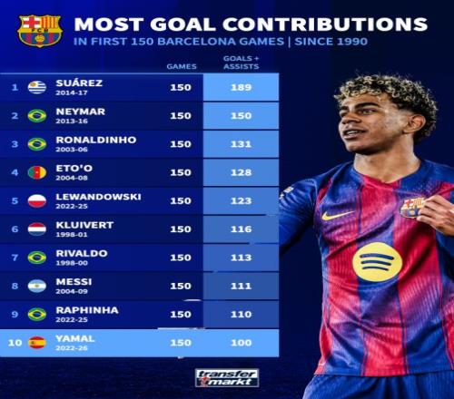 同時(shí),在巴薩前150場進(jìn)球參與最多的球員榜單中,亞馬爾也躋身歷史前十。