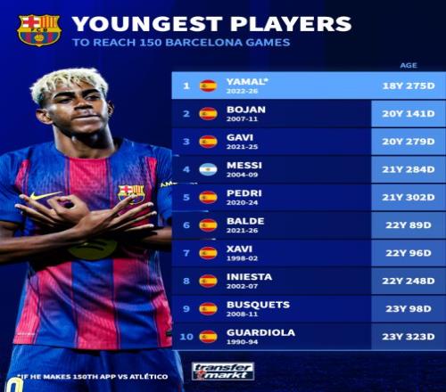 亞馬爾完成150場時(shí)只有18歲零275天,是巴薩隊(duì)史達(dá)到這一里程碑最年輕的球員。他打破了博揚(yáng)的紀(jì)錄——博揚(yáng)在2011年完成150場時(shí)是20歲零141天,比亞馬爾大了將近兩歲。