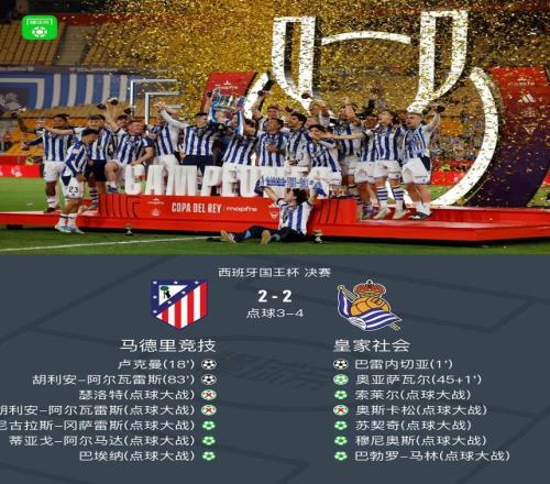 北京時(shí)間4月19日西班牙國(guó)王杯 決賽,馬德里競(jìng)技對(duì)陣皇家社會(huì)。上半場(chǎng)巴雷內(nèi)切亞閃擊,盧克曼低射扳平比分,補(bǔ)時(shí)階段格德斯造點(diǎn),奧亞薩瓦爾點(diǎn)射破門。下半場(chǎng)82分鐘阿爾瓦雷斯破門扳平比分,雙方90分鐘戰(zhàn)成2-2平進(jìn)入加時(shí)。加時(shí)賽雙方均無進(jìn)球進(jìn)入點(diǎn)球大戰(zhàn)。點(diǎn)球大戰(zhàn)中瑟洛特、小蜘蛛失點(diǎn),皇家社會(huì)最終點(diǎn)殺馬競(jìng)奪冠。