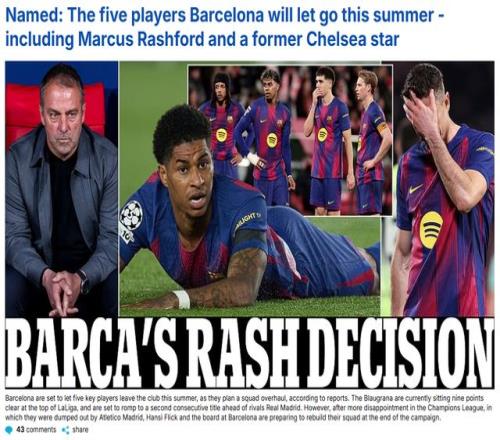 巴薩的2025-26賽季,還剩最后7場西甲比賽。4月21日,《馬卡報》和《每日郵報》指出,今年夏天,巴薩計劃讓5名球員離隊,釋放薪資空間、籌集轉(zhuǎn)會費、達成“1:1規(guī)則”。