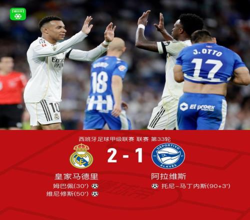 北京時間4月22日西班牙足球甲級聯(lián)賽第33輪,皇家馬德里主場對陣阿拉維斯。上半場,姆巴佩射門折射入網(wǎng)。米利唐射門擊中橫梁,不過巴西人也在這次射門中受傷被替換下場。下半場,維尼修斯轟入世界波。補時階段,托尼-馬丁內(nèi)斯破門。全場比賽結(jié)束,皇馬2-1戰(zhàn)勝阿拉維斯。