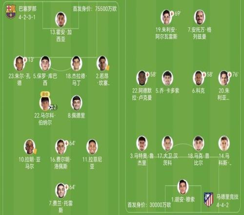 弗里克派上費蘭-托雷斯,亞馬爾、費爾明和拉菲尼亞組成進(jìn)攻群,西蒙尼派出阿爾瓦雷斯和格列茲曼雙前鋒。