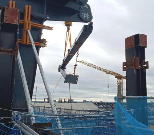 正如《Culemanía》此前披露,德國公司Montage Service將負(fù)責(zé)頂棚鋼纜的安裝和張拉、特殊膜結(jié)構(gòu)屋頂?shù)匿佋O(shè)、太陽能板安裝以及照明系統(tǒng)的組裝。雖然距離頂棚安裝仍有大約一年時間,但利馬克公司已經(jīng)在為后續(xù)工程做準(zhǔn)備。工人正在安裝共46根支撐立柱,這些立柱將支撐球場頂棚的主體結(jié)構(gòu)。每根梁重約28噸,高約五米,通過大型起重機吊裝至第十層結(jié)構(gòu)位置,這一層將構(gòu)成未來球場頂棚。