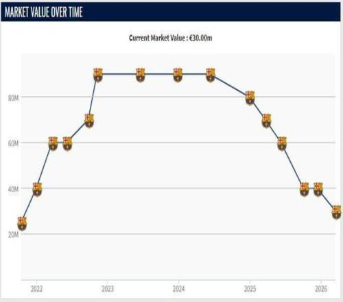 加維的巔峰身價是2022年11月到2024年6月的9000萬歐元,但由于23-24賽季開始遭遇傷病問題,他的身價開始下跌,本賽季他同樣受到了傷病的影響,因此身價下跌到了3000萬歐元,僅為巔峰身價的1/3。