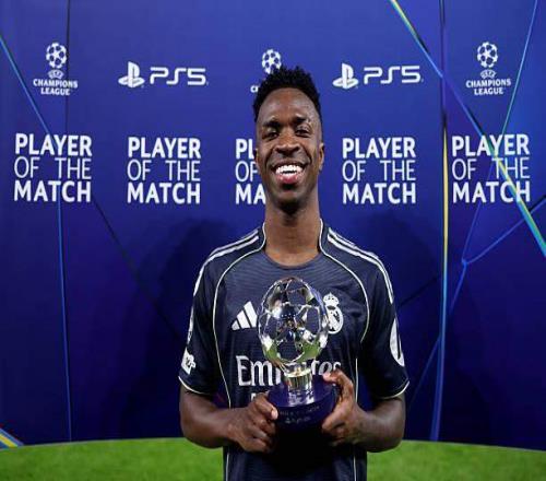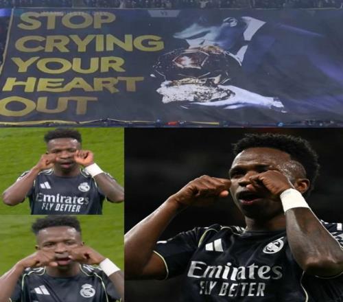 第22分鐘,維尼修斯操刀點球騙過唐納魯馬得分,皇馬1比0領(lǐng)先,總比分4比0。進球后,維尼修斯做出“愛哭鬼”的動作,回?fù)袈乔蛎詼?zhǔn)備的羅德里巨型海報,并跑到角旗處示威慶祝。