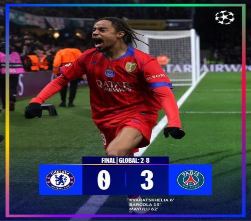 切爾西次回合回到主場,0-3不敵巴黎再次遭遇慘敗??送呃暮绽麃啞蜖柨评?、馬尤盧各入一球,巴黎兩回合總比分8-2橫掃輕松挺進八強。
