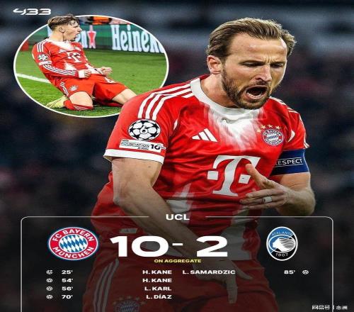 拜仁主場4-1、總比分10-2亞特蘭大晉級歐冠八強,將對陣皇馬。凱恩造點+點射命中,下半場凱恩再進(jìn)一球,卡爾、迪亞斯錦上添花,薩馬爾季奇扳回一城。