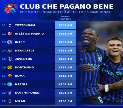 本賽季五大聯(lián)賽球隊(duì)年薪TOP20: