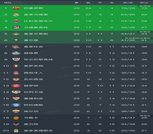 隨著皇馬32,巴薩10,西甲第29輪最新排名出爐!馬競(jìng)下滑第4