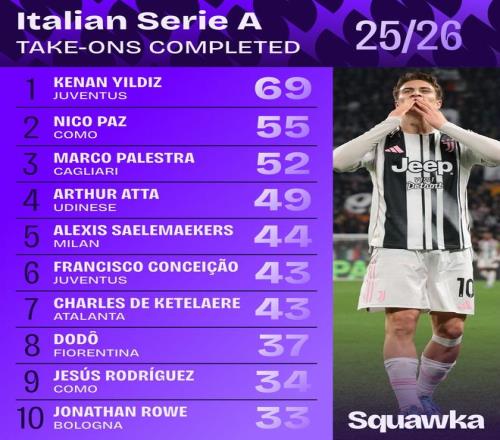 數(shù)據(jù)機構(gòu)“Squawka”統(tǒng)計出本賽季截至目前,意甲球員成功過人次數(shù)榜,尤文邊鋒伊爾迪茲69次居首,科莫中場尼科-帕斯55次排第二。