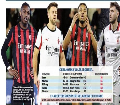 雖然目前AC米蘭在意甲積分榜上排名第三,但本賽季全隊聯(lián)賽總進球數(shù)僅為47球,是爭冠集團中最少的,要知道領頭羊國際米蘭同期轟入 71球,進球數(shù)比米蘭多了整整24個。紅黑軍團前鋒的進球貢獻占比之低,更令人咋舌。當對手的前鋒們頻頻登上射手榜時,米蘭的進球重任卻在相當程度上由中后場球員承擔。帕夫洛維奇、拉比奧、福法納,這些名字接連出現(xiàn)在進球者名單上,已經成了某種諷刺性的“常規(guī)武器”