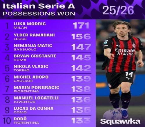 更讓人欽佩的是,40歲的莫德里奇不但出勤率高,多項(xiàng)數(shù)據(jù)也名列意甲前茅。31輪聯(lián)賽戰(zhàn)罷,他的場均傳球數(shù)超過66次,排名意甲第2,成功率達(dá)到90.6%,其中場均發(fā)動(dòng)7次長傳,準(zhǔn)確率高達(dá)73.8%。魔笛累計(jì)已送出50次關(guān)鍵傳球,排名隊(duì)內(nèi)首位,所有意甲球員第9名。