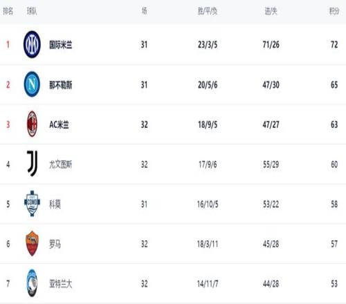 在積分榜上,國(guó)際米蘭遙遙領(lǐng)先,以72分高居榜首,戰(zhàn)績(jī)是23勝3平5負(fù)。而那不勒斯以65分排名第2,落后了7分,爭(zhēng)冠難度很大。AC米蘭輸球,依然是63分,排名第3。AC米蘭此前是奪冠熱門之一,由于近段時(shí)間頻頻丟分,導(dǎo)致爭(zhēng)冠形勢(shì)惡化,現(xiàn)如今爭(zhēng)冠基本失去希望。尤文圖斯以60分排名第4。第5的是科莫,拿到58分??颇扔任膱D斯少踢1場(chǎng),接下來(lái)還是有希望超越尤文圖斯。羅馬以57分排名第6。