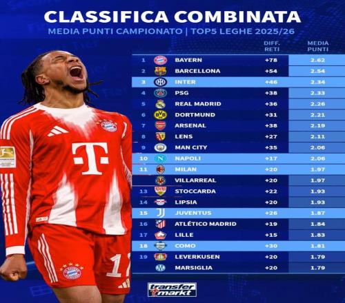 北京時(shí)間4月15日,德轉(zhuǎn)統(tǒng)計(jì)出了本賽季至今歐洲五大聯(lián)賽場(chǎng)均積分最高的20支球隊(duì),拜仁慕尼黑以2.62分和+78的凈勝球高居所有球隊(duì)的第一位,西甲領(lǐng)頭羊巴塞羅那2.54分第二,意甲領(lǐng)頭羊國(guó)際米蘭2.34分第三,阿森納跌至第7位。