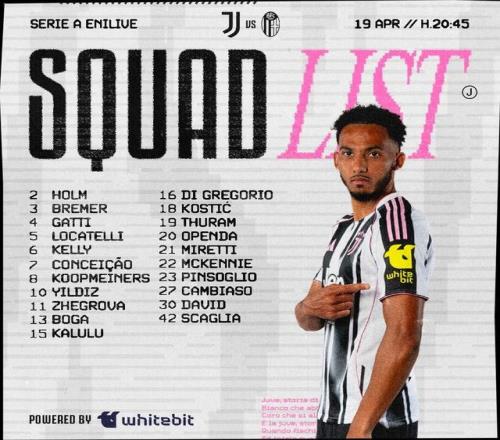 北京時間4月19日,尤文官方公布聯(lián)賽第33輪,主場對陣博洛尼亞的大名單。伊爾迪茲領(lǐng)銜,麥肯尼解禁回歸,弗拉霍維奇、佩林、米利克、阿季奇、卡瓦爾傷缺。