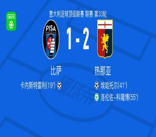 北京時間4月20日意大利足球頂級聯(lián)賽第33輪,比薩主場對陣熱那亞。比賽中,比薩球員卡內(nèi)斯特雷利率先破門;隨后熱那亞球員埃哈托爾打入一球,洛倫佐-科隆博也成功破門。最終比分比薩1-2熱那亞。