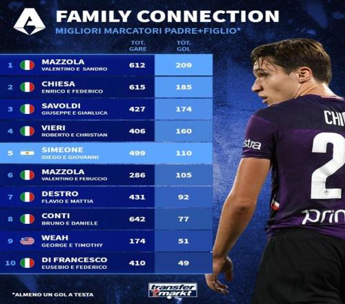 意甲歷史父子進(jìn)球榜:基耶薩父子第2,西蒙尼父子第5