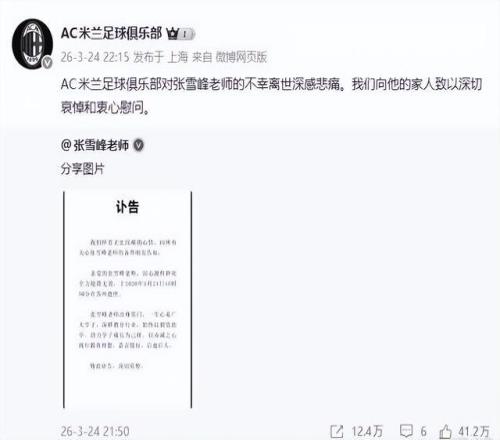3月24日晚上,手機(jī)上推送的一則消息,瞬間令人唏噓感嘆。張雪峰猝然離世,看到網(wǎng)友感慨失去了一位教育引路人,AC米蘭足球俱樂(lè)部官博發(fā)文衷心慰問(wèn)。