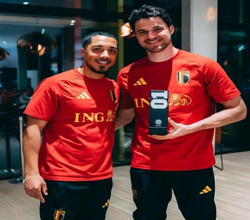 比利時(shí)國(guó)家隊(duì)隊(duì)長(zhǎng)蒂萊曼斯為拉門斯頒發(fā)他的首秀紀(jì)念獎(jiǎng)杯