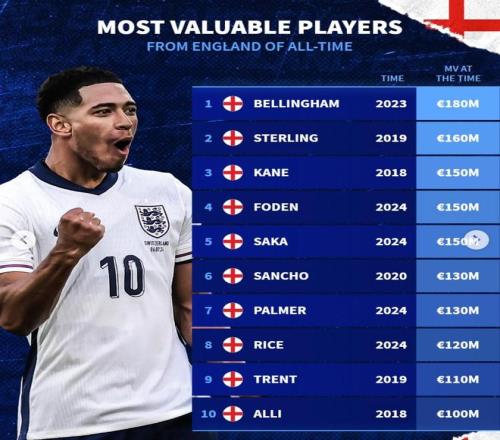北京時間3月31日,德轉(zhuǎn)列出了英格蘭球員歷史身價榜,貝林厄姆1.8億歐元第一,斯特林1.6億歐元第二,哈里-凱恩、福登、薩卡同以1.5億歐元并列第三。