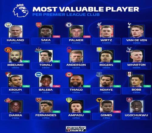 德轉(zhuǎn)列英超20隊(duì)身價(jià)最高球員:哈蘭德2億第1,兩人2500萬(wàn)最低