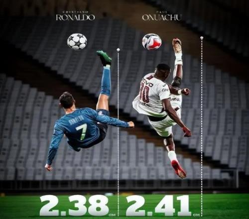 更令人瞠目結(jié)舌的是數(shù)據(jù)。當(dāng)時奧努阿楚這記倒鉤的抬腳高度達(dá)到了2.41米。這是什么概念?這打破了此前由C羅保持的2.38米的紀(jì)錄(此后這一紀(jì)錄,被麥克托米奈在世預(yù)賽蘇格蘭對陣丹麥比賽中打進(jìn)的倒鉤進(jìn)球所打破,2.53米)。在那一刻,奧努阿楚的鞋釘,比很多球員跳起來的頭頂還要高。一個身高2米、體重接近100公斤的男人,在空中完成了如此極限的拉伸與發(fā)力,這簡直是一場反重力的視覺沖擊。