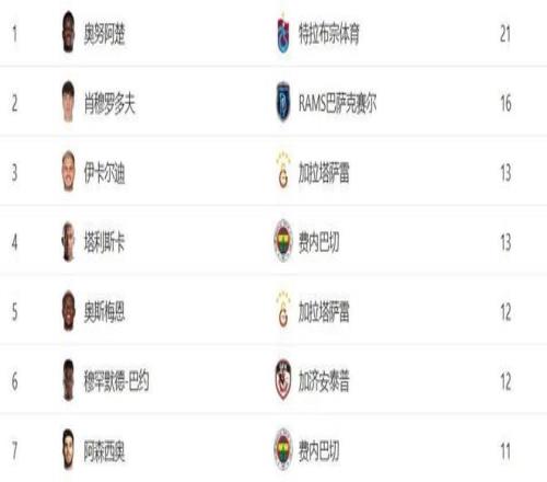 在本賽季土超射手榜上,2米01的鋒霸奧努阿楚以絕對優(yōu)勢領(lǐng)跑射手榜。奧努阿楚本賽季在土超出場24次打進(jìn)21球(含6點球),場均0.88球,目前在射手榜上以5球優(yōu)勢領(lǐng)跑。他的身后正是奧斯梅恩、伊卡爾迪等昔日五大聯(lián)賽的金靴們。