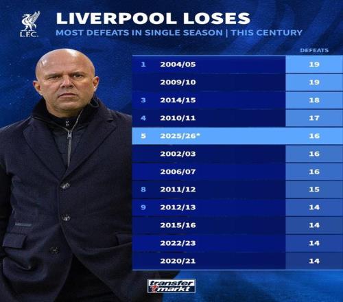 4月6日,德國(guó)轉(zhuǎn)會(huì)市場(chǎng)網(wǎng)站列出了利物浦本世紀(jì)單賽季輸球場(chǎng)次排行,利物浦本賽季已輸16場(chǎng)(含社區(qū)盾點(diǎn)球大戰(zhàn)告負(fù)),位列第五。