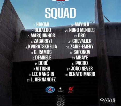 前鋒:7-克瓦拉茨赫利亞、9-貢薩洛-拉莫斯、10-登貝萊、14-杜埃、27-德羅-費(fèi)爾南德斯、49-姆巴耶
