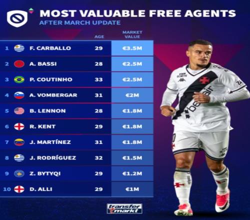 四月份德國《轉(zhuǎn)會市場》的最新身價更新,重新盤點了全球足壇最有價值的自由球員,讓大家看到在這個階段還能免簽哪些球星。