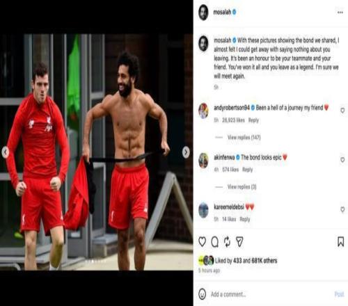在社交媒體上,薩拉赫帶頭向羅伯遜發(fā)出致敬:“看著這些照片展現(xiàn)的我們之間的情誼,我覺得不需要再多說什么了。能成為你的隊(duì)友和朋友是一種榮幸。你贏得了一切,并且以傳奇的身份離開。我相信我們一定會再見。”