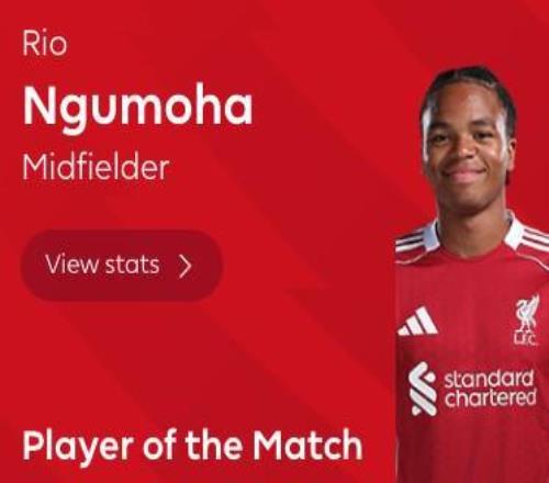 此役主場對陣富勒姆,首發(fā)出戰(zhàn)的恩古莫哈在比賽第36分鐘兜射破門,幫助利物浦取得領(lǐng)先,最終2-0取勝。