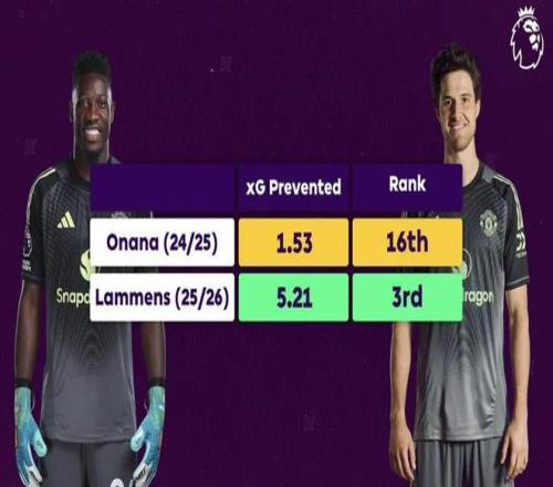 23歲的拉門斯扼殺了對(duì)手的5.21個(gè)預(yù)期進(jìn)球,排名英超第三。與之對(duì)比,2024/25賽季的奧納納,只減少了1.53球,排在英超第16位。在門將的本職工作方面,拉門斯完勝奧納納。