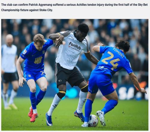 就在?;倏酥貍暗囊恢?,效力于英冠德比郡的美國前鋒帕特里克·阿杰芒同樣遭遇跟腱斷裂重傷,無緣世界杯。