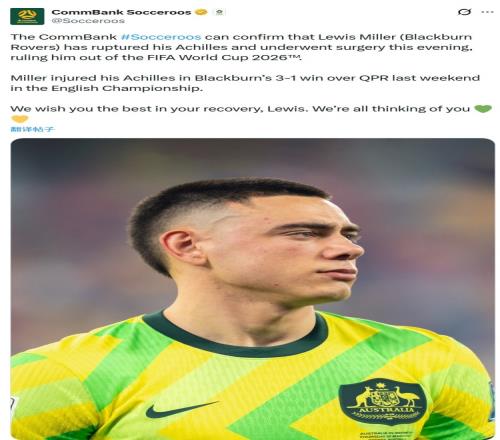進(jìn)入二月份,效力于英冠布萊克本的澳大利亞國腳劉易斯·米勒同樣跟腱斷裂,接受手術(shù)無緣世界杯。