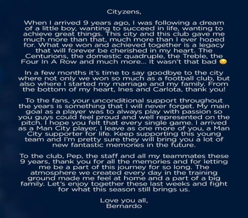 體育播報4月16日宣 曼城中場B席將在本賽季結(jié)束后離隊,B席更新社媒動態(tài),發(fā)布告別信。