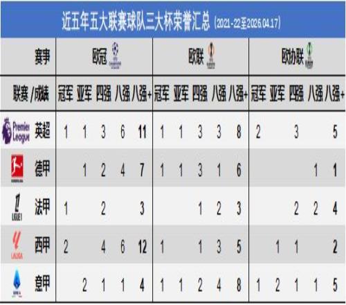 另外,各大聯(lián)賽在三大杯中進(jìn)入八強(qiáng)、四強(qiáng)、決賽的次數(shù),也可以作為評(píng)價(jià)一個(gè)聯(lián)賽實(shí)力的重要維度。