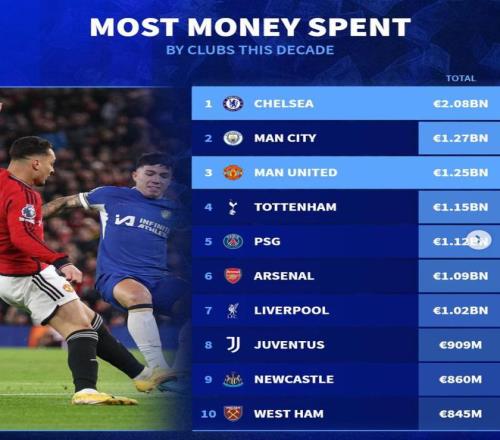 俱樂部近10年轉(zhuǎn)會支出榜:切爾西超20億第1,曼聯(lián)第3,熱刺第4