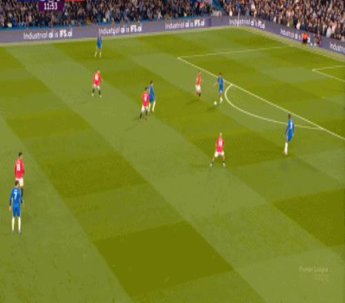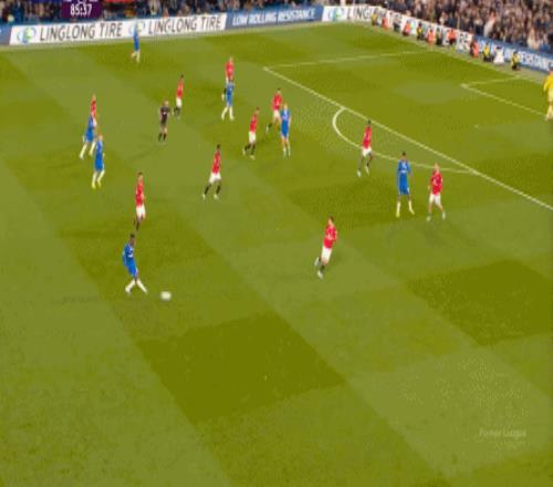 但是,切爾西畢竟是在主場作戰(zhàn),而且曼聯(lián)的隱患也不止出現(xiàn)在后衛(wèi)線,中場的問題也不容忽視,所以在第10分鐘,切爾西就用斜向的線路,直接打穿了曼聯(lián)的中場,迫使盧克-肖和海文都需要快速補位,甚至需要在危險區(qū)域使用大動作來彌補: