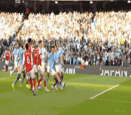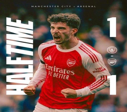 第20分鐘,曼城球員哈蘭德突破橫傳,塞門約單刀機會意外滑倒!第36分鐘,莫斯克拉故意拉拽對手吃到黃牌!第44分鐘,B-席角球直接攻門,被薩利巴門線解圍!半場結束,曼城1-1阿森納。