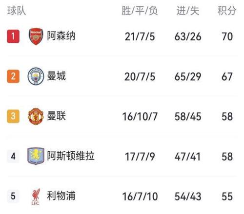 曼城在少賽1輪的情況下,32輪比賽積67分,與33輪積70分的阿森納只相差3分了,英超爭(zhēng)冠懸念拉滿!
